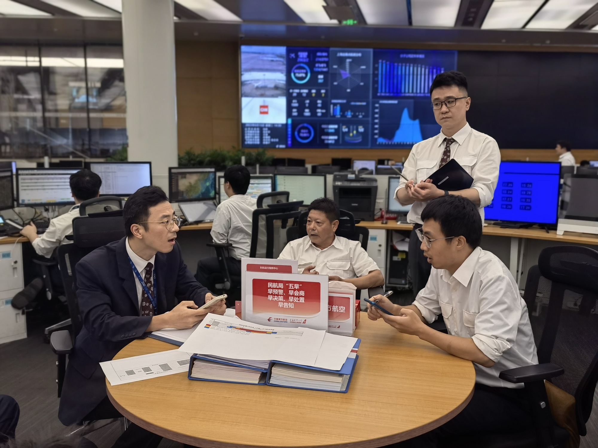 暑運期間,東航的航班量高位運行,日均客座率、航班量幾乎都維持在80%左右、3000班以上,這就對航空公司的各項工作提出了更高的要求。“各席位注意了!馬上到?jīng)Q策區(qū)開臺風(fēng)決策會?!彪S著陳春益發(fā)出的指令在OCC響起,十幾個來自氣象、簽派等不同席位的同事迅速聚集在決策區(qū)內(nèi),共同對第二天臺風(fēng)逼近下的航班運行開始了新一輪研判。