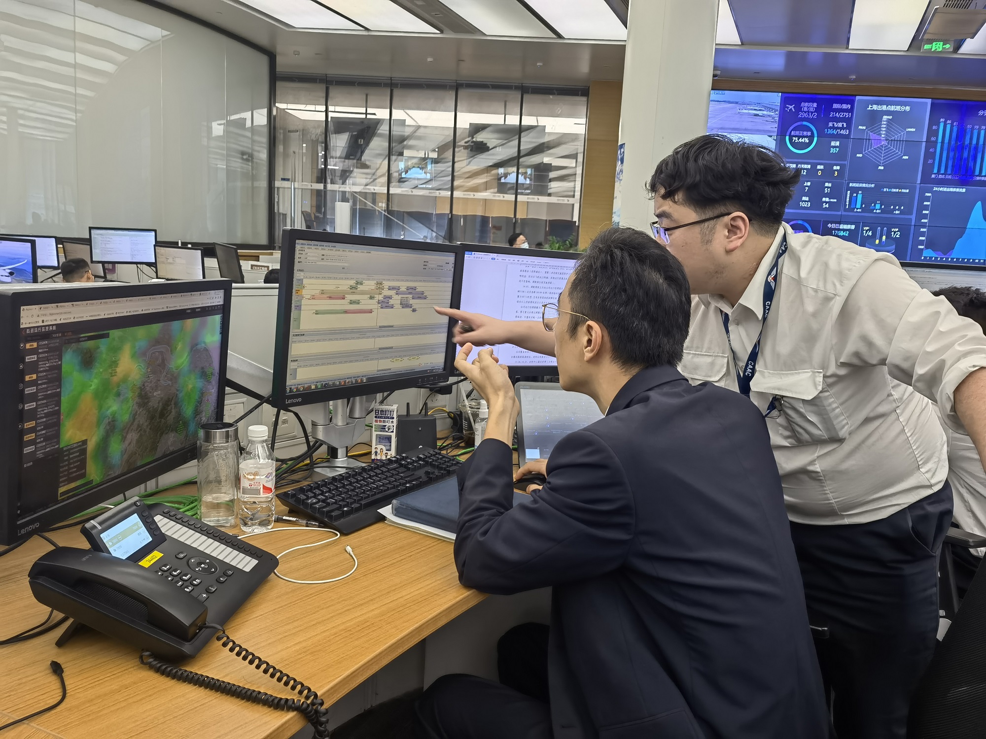 暑運旺季的東指中心席位,一天24小時,都伴隨著這樣此起彼伏的電話鈴聲。陳春益所在的團隊有4個人,成員有運行主任、運行經(jīng)理、助理和協(xié)理,他們堅守在航班運行決策指揮第一線?!拔覀兠總€人都分工明確,但是第一時間接聽各單位各站點打來的電話,是我們共同的任務(wù)?!标惔阂嬲f:“電話里反饋的都是可能影響航班有序運行的突發(fā)事件,一定要盡快處置……”