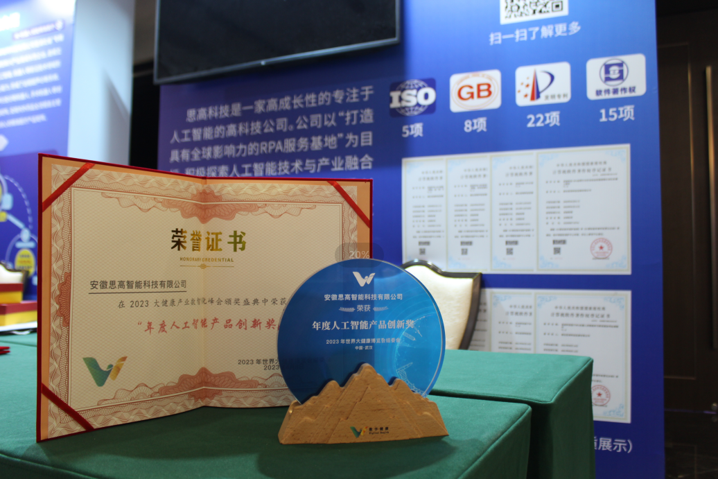 在頒獎環(huán)節(jié)中,思高科技憑借公司核心人工智能軟件產(chǎn)品——“RPA+AI數(shù)字員工”的產(chǎn)品實力和技術(shù)創(chuàng)新榮獲“年度人工智能產(chǎn)品創(chuàng)新獎 ”,思高科技董事長付磊憑借在助推大健康產(chǎn)業(yè)數(shù)字化轉(zhuǎn)型中的突出貢獻榮獲“年度大健康產(chǎn)業(yè)數(shù)字化創(chuàng)新人物獎”,獎項的獲得不僅是對公司人工智能技術(shù)的實力認可,也是對公司在大健康產(chǎn)業(yè)的持續(xù)創(chuàng)新和進步的肯定。