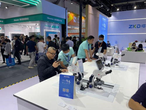 ▲領(lǐng)導(dǎo)、嘉賓和觀眾參觀了解生物顯微鏡升降實(shí)驗(yàn)桌