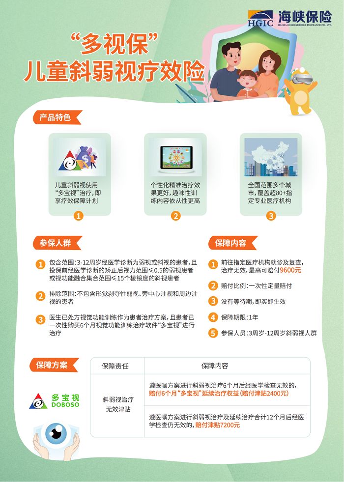 弱視和斜視作為兒童眼科的常見疾病,是導(dǎo)致兒童視覺障礙的主要原因,不僅影響兒童的正常視覺功能,對生活學(xué)習(xí)造成困擾,甚至影響未來的工作能力,孩子一旦診斷為斜弱視應(yīng)及早診治。然而,受到斜弱視本身治療周期長、收效慢、易復(fù)發(fā)、治療花費(fèi)多等特點(diǎn)的影響,對于孩子斜弱視的治療,許多家長顧慮重重,治療信心也不足,可能更有甚者會因?yàn)殄e(cuò)誤的認(rèn)知或者為了單純省錢而選擇了不適宜孩子實(shí)際病情的治療方法,最后耽誤了孩子病情,悔之晚矣。那么是否有一款專門針對兒童斜弱視的產(chǎn)品,既可以有效治療疾病受到專家權(quán)威認(rèn)可,又可以讓孩子開心愉悅治療提高依從性,還可以對治療效果進(jìn)行保駕護(hù)航呢?相信這是絕大多數(shù)斜弱視患兒家長心中一直期待的完美方案,現(xiàn)在“多視?!钡臋M空出世終于讓家長們的期待夢想成真。視景醫(yī)療一直堅(jiān)持“以患者為中心,以療效為導(dǎo)向”的初心,攜專業(yè)團(tuán)隊(duì)與海峽保險(xiǎn)共同推出全球商保領(lǐng)域首個(gè)兒童斜弱視療效險(xiǎn)產(chǎn)品“多視?!?#xff0c;為我國兒童斜弱視患者及家庭帶來更好的治療保障選擇。