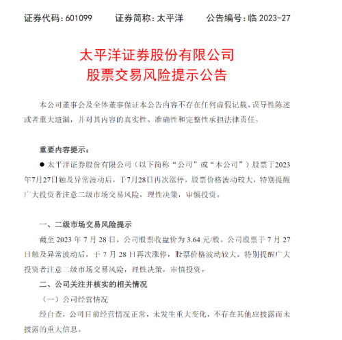 同時,太平洋證券稱,公司股票在2023年7月25日、7月26日、7月27日連續(xù)三個交易日內(nèi)收盤價格漲幅偏離值累計達到20%,屬于股票交易異常波動情形。