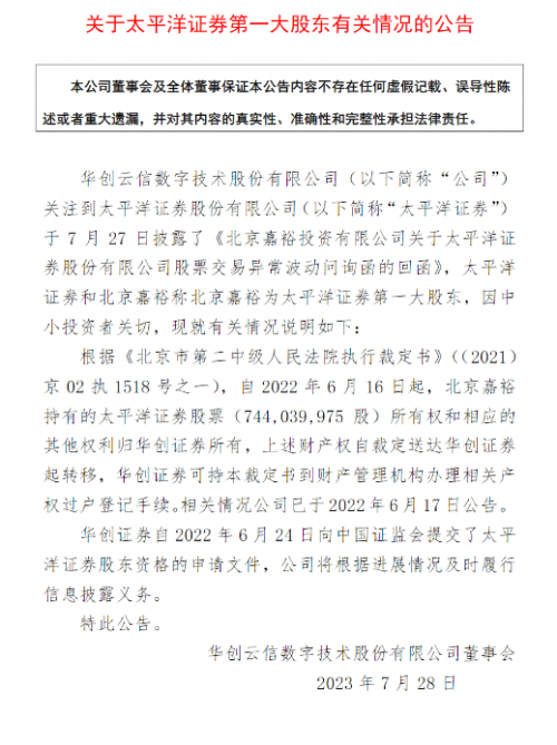 7月28日,華創(chuàng)云信發(fā)布公告稱,根據(jù)法院執(zhí)行裁定書,自2022年6月16日起,北京嘉裕持有的太平洋證券股票7.44億股所有權(quán)和相應(yīng)的其他權(quán)利歸華創(chuàng)證券所有,上述財產(chǎn)權(quán)自裁定送達華創(chuàng)證券起轉(zhuǎn)移,華創(chuàng)證券可持本裁定書到財產(chǎn)管理機構(gòu)辦理相關(guān)產(chǎn)權(quán)過戶登記手續(xù)。