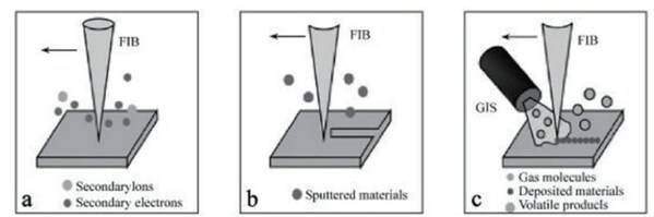 FIB-SEM示意圖,與聚焦離子束的三種工作模式 a.成像;b.加工;c.沉積 來(lái)源:蔡司,NE時(shí)代整理