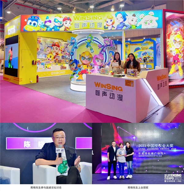 ? 6月28日至30日,詠聲動漫攜旗下豬豬俠、百變校巴、詠玩潮·羊圓圓等IP空降2023全球授權(quán)展·上海站(LEC),兩大全新IP《喵能戰(zhàn)士》《反斗聯(lián)萌》首次亮相,吸引眾多企業(yè)現(xiàn)場咨詢。展會期間,詠聲動漫副總裁、國際授權(quán)業(yè)協(xié)會大中華區(qū)顧問委員陳曉先生作為“2023年授權(quán)業(yè)論壇——圓桌對話”嘉賓,和多位行業(yè)大咖一起探討消費復蘇的當下,授權(quán)商與被授權(quán)商該如何應對急速變換的市場趨勢,現(xiàn)場分享實戰(zhàn)經(jīng)驗,共同促進行業(yè)發(fā)展;此后,陳曉先生受邀出席 “2023中國授權(quán)業(yè)大獎”頒獎典禮,上臺為“年度授權(quán)推廣項目”頒發(fā)獎項。