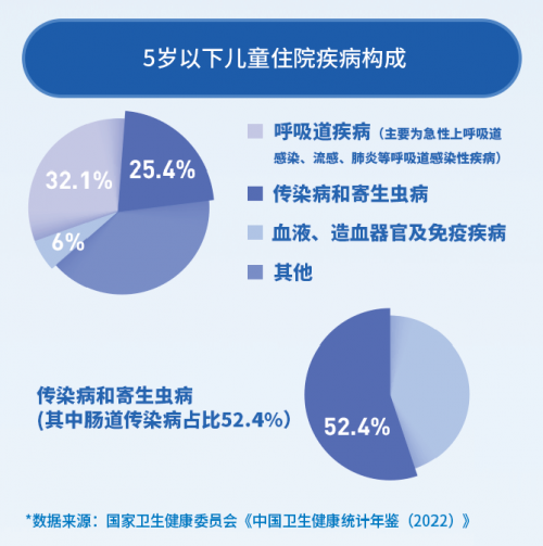 調查報告也顯示,0-14歲兒童住院病人中,5歲以下兒童占比65%,而住院疾病構成中,呼吸系統(tǒng)疾病和腸道傳染病總體占比近50%,為住院疾病負擔主因。如何提高兒童免疫力,成了保障兒童健康的關鍵因素。