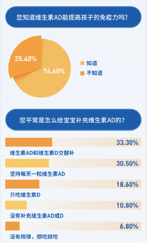 調查報告還顯示,雖然7成的家長認可維生素AD對提高免疫力的作用,但有7成的家長用錯了方法,比如選擇AD和D交替補、只補D不補A、補補停停等。專家提醒,家長一定要重視孩子日常營養(yǎng)的攝入,堅持每天補充維生素AD是最佳方案。