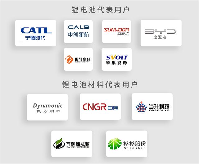 鋰電池企業(yè):寧德時代?,比亞迪?,中創(chuàng)新航,國軒高科,欣旺達(dá),蜂巢能源等。鋰電材料企業(yè):德方納米,中偉股份,當(dāng)升科技,湖北萬潤,杉杉股份等,均為我公司長期用戶。