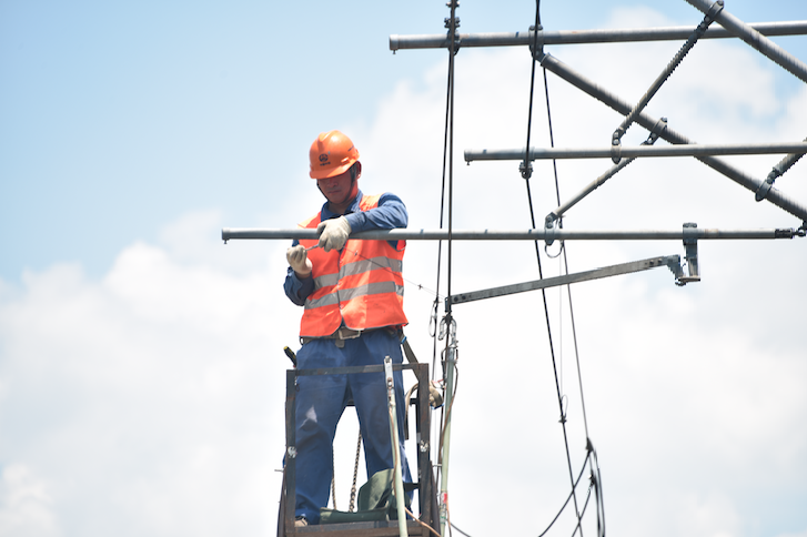 終于等到車梯豎起來,“扶好車梯!”剛囑咐好輔助人員,劉冉就帶著小李竄到了車梯上,現(xiàn)在的他只想早點干完活,早點休息??蓜傞_始干活沒一會,劉冉看著腕臂上動作又慢又變扭的小李就來了脾氣,“墨跡什么呢,身體貼在腕臂上干,搞快點!”“劉工,主要是這腕臂太燙了?!毙±詈芪慕忉尩?。不光線路上熱,此時支柱上的金屬設(shè)備因為曬了一上午,溫度已經(jīng)超過50℃,帶著手套還感覺不出來,但隔著一層薄衣服的話就燙的難受?!澳阏拒囂菘蚶锔?#xff0c;我過去?!笨吹皆O(shè)備溫度都這么高,此時的劉冉更擔(dān)心大家的身體,可千萬別中暑了啊。
