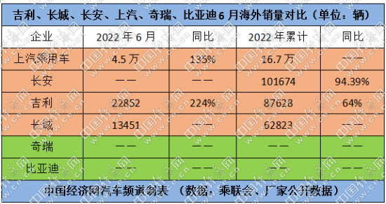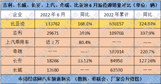 中國經(jīng)濟(jì)網(wǎng)記者通過梳理廠家公開的數(shù)據(jù)和乘聯(lián)會發(fā)布的數(shù)據(jù)發(fā)現(xiàn),6月,比亞迪乘用車、吉利、長安乘用車、長城的銷量分別為133762輛、126595輛、118303輛、101186輛,同比分別上漲168.8%%、26%、37.6%、0.52%;上半年累計銷量分別為641350輛、613842輛、629175輛、518525輛,同比分別上漲314.9%、-3%、-4.61%、-16.12%。?