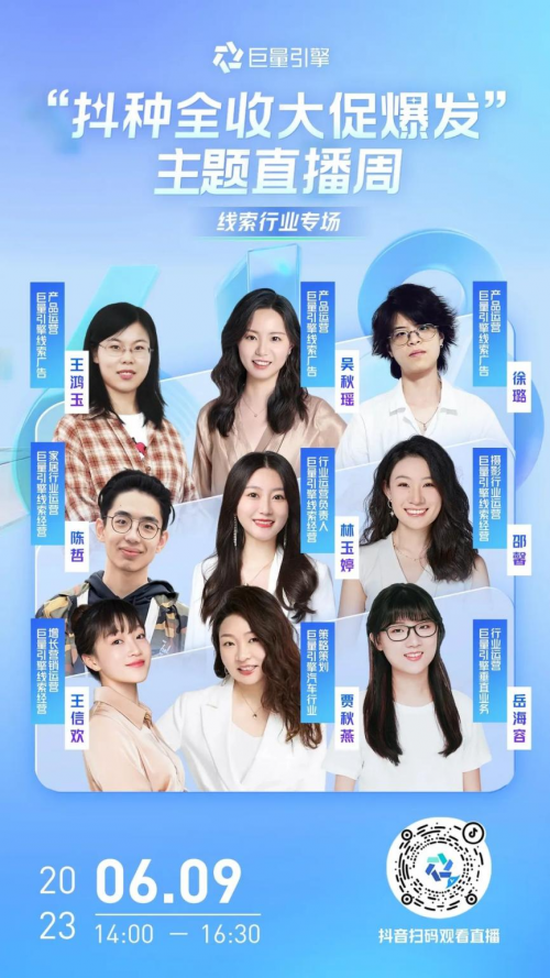 關(guān)注“巨量引擎小助手”抖音號(hào),6月9日14:00,來線索行業(yè)618直播專場(chǎng),了解更多活動(dòng)政策及作戰(zhàn)攻略。