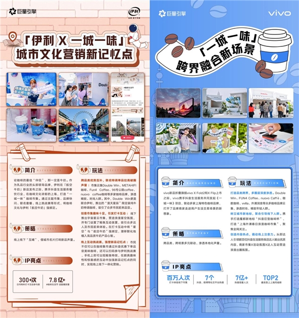 在垂類營銷層面,抖音生活服務打造《一城一味》IP,分別聯(lián)合vivo、伊利開展跨界營銷,借由上??Х任幕芗啊翱Х仁小钡某鞘形幕?通過線上種草、線下聚合客流打卡體驗的方式,將品牌新品融入用戶高頻生活場景,有力強化上海本地消費者對新品的認知。