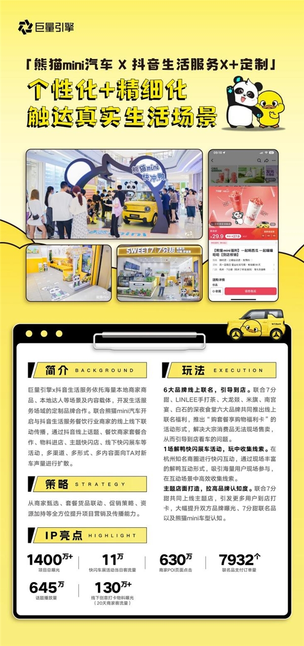 針對線索獲取成本高、轉(zhuǎn)化鏈路長等痛點,抖音生活服務聯(lián)手熊貓mini,攜手七分甜、LINLEE手打茶等六大品牌打造聯(lián)名福利,并在核銷等生活場景中植入新車,既擴散新車聲量,又高效收集高意向線索。