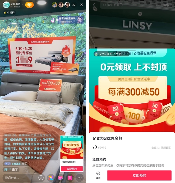 為此,在大促期間,林氏家居特意通過凸顯活動優(yōu)惠的多種物料增加直播間大促氛圍 ,利用一目了然的優(yōu)惠信息吸引用戶駐足,借助包括商品介紹、稀缺性優(yōu)惠劵推介等標(biāo)準(zhǔn)化、模塊化的直播話術(shù),強(qiáng)調(diào)活動優(yōu)惠信息,加速產(chǎn)品種草,引導(dǎo)用戶領(lǐng)取優(yōu)惠進(jìn)行留資,線下到店購買商品。