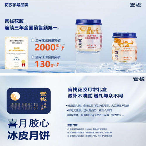 官棧極其重視此次展會(huì),不僅帶來6大主力產(chǎn)品線,包括鮮燉花膠、即食花膠、輕食花膠、花膠料理、干花膠和季節(jié)限定禮盒;還帶來兩款重磅新品:港式花膠羹,以及首次對(duì)外展示的《溏心風(fēng)暴之家好月圓》IP聯(lián)名款花膠流心月餅禮盒,從而帶給采購商更多選擇。