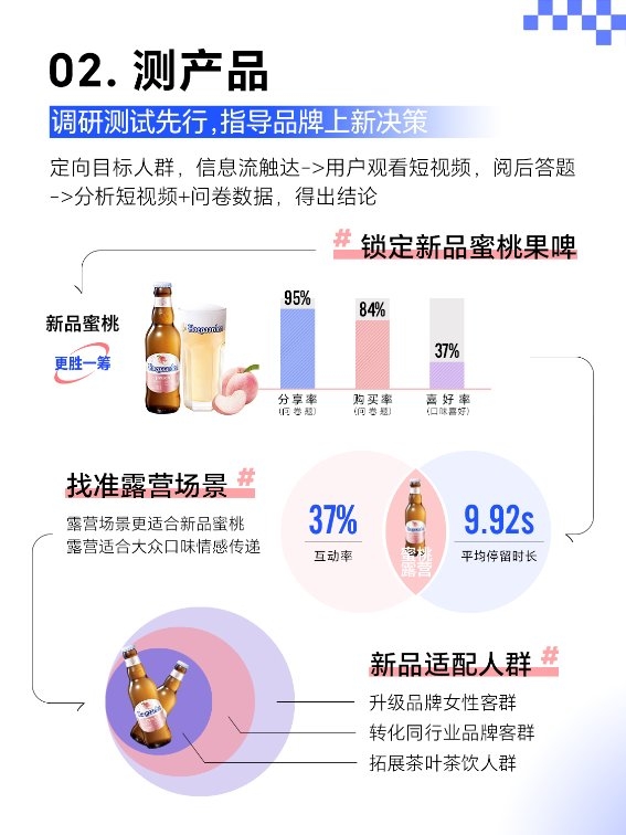 為了更快、更準(zhǔn)地抓住抖音市場(chǎng)機(jī)會(huì),福佳在新品實(shí)驗(yàn)室指導(dǎo)下,詳細(xì)制定2個(gè)新品×9個(gè)人群×4套素材的測(cè)試方案。針對(duì)目標(biāo)客群、內(nèi)容、商品,通過(guò)信息流快速觸達(dá)進(jìn)行測(cè)試,得出新品潛力、人群價(jià)值及受訪者偏好的內(nèi)容場(chǎng)景,發(fā)現(xiàn)蜜桃口味更受消費(fèi)者偏愛(ài),適合在露營(yíng)場(chǎng)景進(jìn)行傳播。福佳基于此進(jìn)行貨品布局,確定整體策略的優(yōu)化方向。