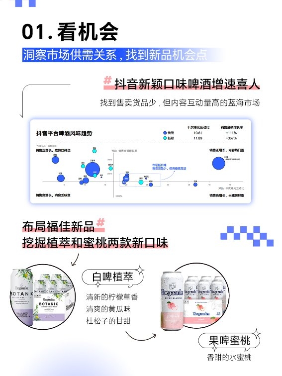 基于巨量云圖商品洞察能力,福佳對(duì)抖音啤酒大盤(pán)現(xiàn)狀及細(xì)分賽道趨勢(shì)進(jìn)行分析,發(fā)現(xiàn)抖音啤酒細(xì)分類(lèi)目均正增長(zhǎng),其中白啤增長(zhǎng)最可觀,果啤趨向高客單商品。進(jìn)一步洞察抖音啤酒風(fēng)味趨勢(shì)發(fā)現(xiàn),新穎口味啤酒增速喜人,黃瓜和桃子兩種口味受抖音消費(fèi)者關(guān)注,但市場(chǎng)的針對(duì)性供給較少,蘊(yùn)含巨大的發(fā)展?jié)摿?這恰巧與福佳現(xiàn)有產(chǎn)品組合高度匹配。