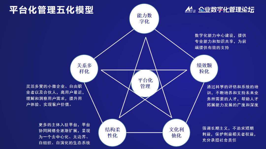 5. 文化利他化:公司文化要強(qiáng)調(diào)堅(jiān)持長(zhǎng)期主義,不能追求短期的利益,以保護(hù)利益相關(guān)者的權(quán)益而充分地承擔(dān)社會(huì)責(zé)任。平臺(tái)化管理的文化是內(nèi)化于心,尤其是外部合伙人要幫助他。