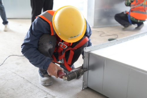 本次競賽分為風(fēng)管加工及安裝、支架焊接兩項分項競賽。在風(fēng)管加工及安裝分項競賽中,評委組選取防排煙系統(tǒng)分支三通作為競賽內(nèi)容,提供風(fēng)管三通半成品部件,參賽工人結(jié)合原設(shè)計圖紙,開展風(fēng)管合口、法蘭鉚接及風(fēng)管安裝作業(yè)。在支架焊接分項競賽中,評委組選取統(tǒng)一的綜合支架,繪制大樣圖,提供相關(guān)工具及材料,參賽人員按照圖紙下料、焊接并完成綜合支架施工。