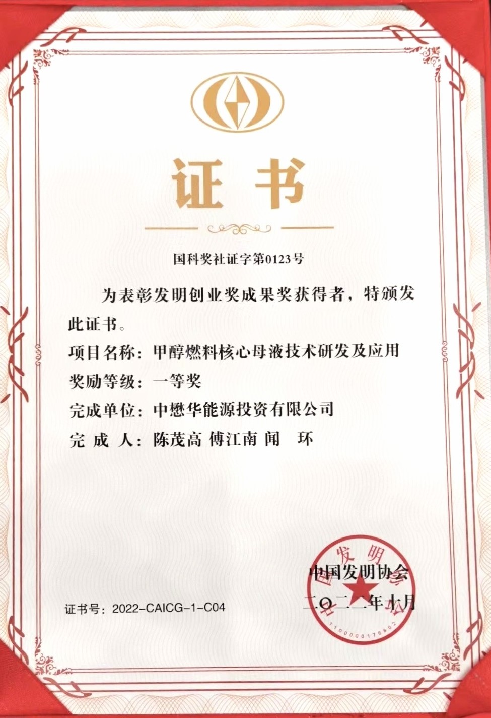 4月25日,由中國發(fā)明協會、科技日報社、國家科學技術獎勵工作辦公室、中國知識產權報社共同舉辦的第十七屆中國發(fā)明家論壇暨發(fā)明創(chuàng)業(yè)獎頒獎典禮在京舉行。第十屆全國人大常委會副委員長、中國關心下一代工作委員會主任顧秀蓮,科學技術部黨組成員、副部長,中國發(fā)明協會理事長吳朝暉,國家知識產權局專利局副局長王嵐?jié)阮I導出席為獲獎代表頒獎。會上由中懋華能源投資有限公司完成的“甲醇燃料核心母液技術研發(fā)及應用”技術成果榮獲發(fā)明創(chuàng)業(yè)獎成果獎一等獎,中懋華能源投資有限公司董事長陳茂高作為獲獎代表出席頒獎典禮。