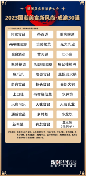 國潮品牌之夜是一場專屬中國美食品牌的加冕之夜。在借由盛典彰顯國潮美食風(fēng)尚之余,觀潮新消費(fèi)還發(fā)布了《2023國潮美食新風(fēng)尚·成渝30強(qiáng)》,旨在打造成渝核心企業(yè)標(biāo)桿,描繪區(qū)域食品工業(yè)發(fā)展藍(lán)圖,為進(jìn)一步推動企業(yè)創(chuàng)新、深化產(chǎn)業(yè)合作、實(shí)現(xiàn)成渝經(jīng)濟(jì)高質(zhì)量發(fā)展提供參考。