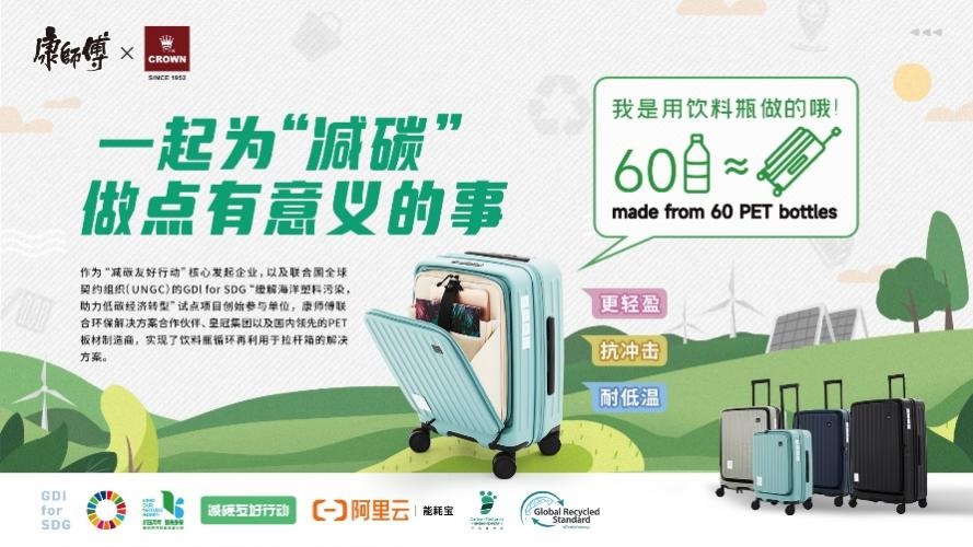 康師傅還作為主要發(fā)起單位之一攜手聯(lián)合國全球契約組織(UNGC)共同發(fā)起了GDI for SDG(全球發(fā)展倡議助力可持續(xù)發(fā)展目標(biāo))的首個(gè)試點(diǎn)項(xiàng)目——“緩解海洋塑料污染,助力低碳經(jīng)濟(jì)轉(zhuǎn)型”,與合作伙伴一道將回收的PET等使用后塑料制品,再造為多種生活消費(fèi)品,又通過電商平臺(tái)的銷售推廣,實(shí)現(xiàn)循環(huán)利用。在前不久的世界地球日,康師傅與環(huán)保解決方案合作伙伴共創(chuàng),實(shí)現(xiàn)了用康師傅廢棄飲料瓶制作拉桿箱、野餐墊、收納盒等環(huán)保周邊產(chǎn)品。其中聯(lián)合旅行箱品牌CROWN皇冠,共同推出環(huán)保旅行箱,也是在電商很受追捧,成為第一個(gè)商業(yè)化的rPET項(xiàng)目。由于應(yīng)用了專利技術(shù),旅行箱使用的回收塑料量大,比現(xiàn)有材料更環(huán)保,而且品質(zhì)更好,無異味,更耐沖擊,耐低溫。這個(gè)項(xiàng)目實(shí)現(xiàn)了從塑料循環(huán)利用到商業(yè)價(jià)值鏈的良性循環(huán),讓業(yè)界看到循環(huán)經(jīng)濟(jì)模式的曙光。