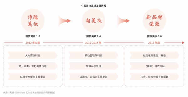 伴隨著大眾媒體、移動(dòng)互聯(lián)網(wǎng)、社交電商的發(fā)展與升級(jí),中國(guó)美妝品牌經(jīng)歷了“傳統(tǒng)美妝→淘美妝→新品牌逆襲”的過程。目前,國(guó)貨美妝已經(jīng)迎來 3.0 時(shí)期,依托社交電商占領(lǐng)消費(fèi)者心智。
