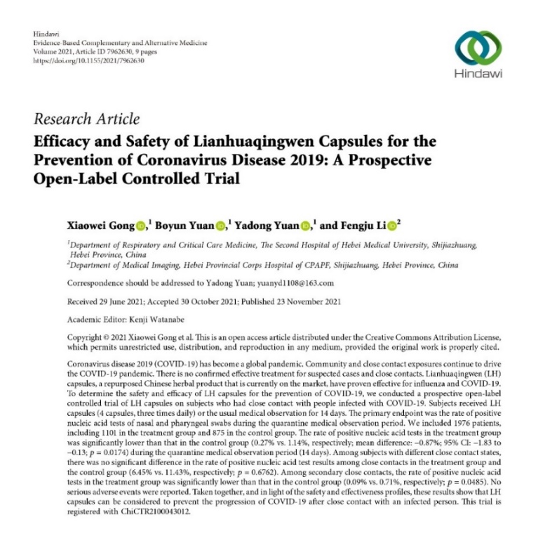 連花清瘟膠囊/顆粒預(yù)防新冠肺炎的作用得到了臨床研究的證實(shí)。前不久,由河北醫(yī)科大學(xué)第二醫(yī)院呼吸與危重癥醫(yī)學(xué)二科主任袁雅冬教授主持開(kāi)展的“連花清瘟膠囊預(yù)防新型冠狀病毒肺炎”真實(shí)世界研究論文被國(guó)際權(quán)威期刊《循證補(bǔ)充和替代醫(yī)學(xué)》刊發(fā)。該論文指出,連花清瘟膠囊在有效治療流感、新冠肺炎COVID-19的同時(shí),兼具預(yù)防新冠肺炎的作用,為新冠疑似病例和密切接觸者提供了新的治療方案。