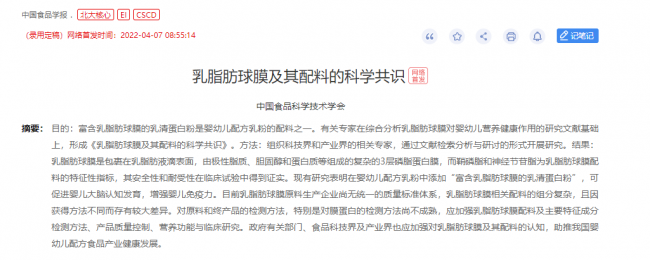 4月7日,《中國食品學(xué)報》刊發(fā)中國食品學(xué)界剛剛?cè)〉玫囊粋€突破性科學(xué)共識成果——中國工程院院士、中國農(nóng)業(yè)大學(xué)營養(yǎng)與健康研究院院長任發(fā)政等近20位中國食品科學(xué)技術(shù)學(xué)會權(quán)威專家形成了國內(nèi)首個《乳脂肪球膜及其配料的科學(xué)共識》(以下簡稱“乳脂肪球膜科學(xué)共識”),共識明確指出,嬰幼兒配方乳粉添加“富含乳脂肪球膜的乳清蛋白粉”后可促進嬰兒大腦認(rèn)知發(fā)育、增強嬰兒免疫力。