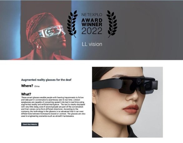 值得關(guān)注的是,在今年的評選中,亮亮視野智能AR字幕眼鏡成為唯一入選該獎(jiǎng)的中國代表,也是AR領(lǐng)域的唯一代表。在活動(dòng)期間Netexplo論壇官網(wǎng)面向全球觀眾進(jìn)行了一個(gè)投票活動(dòng),從10項(xiàng)創(chuàng)新中選出年度最佳創(chuàng)新成果,亮亮視野智能AR字幕眼鏡脫穎而出,與第一名票數(shù)極其接近,獲得第二名,彰顯了大眾對它的肯定和期待。