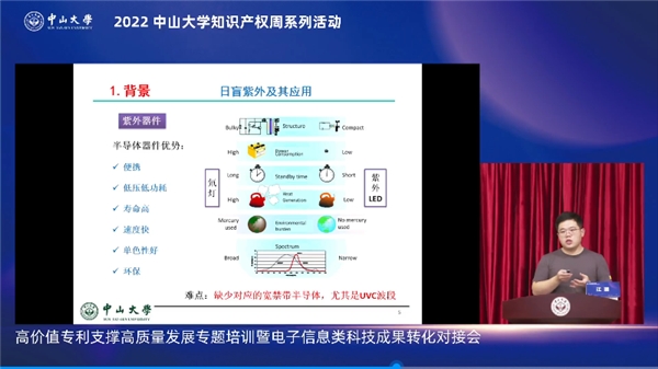 2022年4月28日,在中山大學的全程指導及越秀區(qū)政府的鼎力支持下,中山大學科學研究院、廣州高新區(qū)黃花崗科技園管委會、中山大學圖書館、廣州中大知識產權服務有限公司共同成功主辦中山大學知識產權周系列活動高價值專利支撐高質量發(fā)展專題培訓暨電子信息類科技成果轉化對接會。本次活動采取線上方式開展,邀請兩位業(yè)界專家圍繞高價值專利支撐高質量發(fā)展做專題報告,多達178項電子信息類專利項目與83家企業(yè)進行了精準對接,活動在線人數超2.2萬人,多位知識產權專家及知名企業(yè)在云端匯聚,助力知識產權高質量發(fā)展。