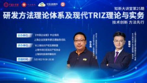 5月18日,中企視訊《知新大講堂》第25期節(jié)目線上開播。RDMI(國際研發(fā)方法協(xié)會)主席、TRIZ五級大師(全球最高級)、DFSS(六西格瑪設(shè)計)黑帶大師孫永偉博士做客中企視訊直播間,長三角知識產(chǎn)權(quán)發(fā)展聯(lián)盟秘書長郭國中擔(dān)任主持人,介紹了現(xiàn)代TRIZ理論體系的組成以及它在技術(shù)創(chuàng)新、新產(chǎn)品研發(fā)、專利布局、規(guī)避、挖掘等專利戰(zhàn)略、運用創(chuàng)新大幅降本等方面的重要作用。
