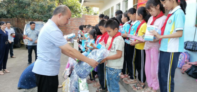 雙蟻藥業(yè)副總經(jīng)理王洪向留守困境兒童分發(fā)學(xué)習(xí)用品
