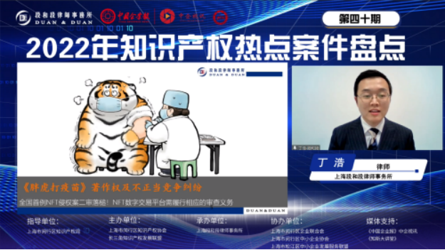 丁浩盤點并解讀了2022年著作權(quán)及商標熱點案例,重點介紹了全國首例NFT侵權(quán)案:《胖虎打疫苗》著作權(quán)及不正當競爭糾紛、嗶哩嗶哩商標無效行政訴訟、范斯公司(VANS,INC.)與高志龍等侵害商標權(quán)糾紛案和搬酒網(wǎng)不正當競爭糾紛案。