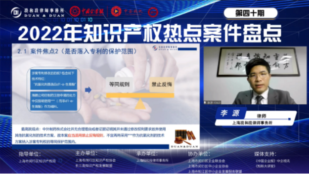 李源從知識產(chǎn)權(quán)律師視角解讀了2022年專利熱點案例,重點介紹了全國首例藥品專利鏈接訴訟案、奧克斯與格力專利系列糾紛、寧德時代與中航鋰電專利糾紛以及自動跟蹤行李箱專利侵權(quán)糾紛。