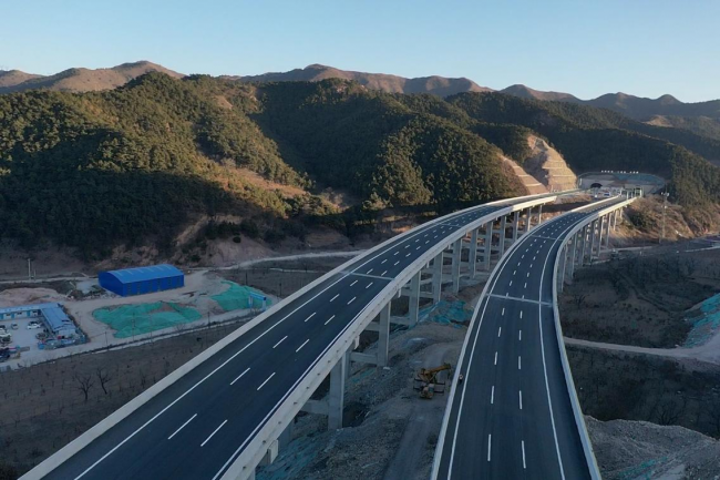 匠心獨(dú)運(yùn) 科技賦能引領(lǐng) 項(xiàng)目地處山區(qū),橋隧比高達(dá)70.7%。干柴峪、林家峪兩座大橋合計(jì)全長1018米,宛若天虹跨于高峽之上。