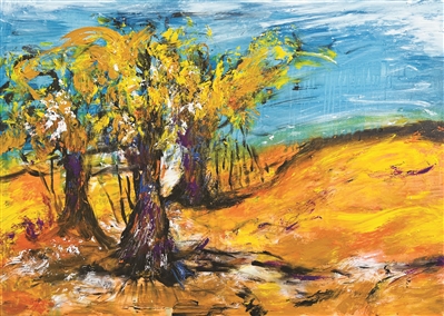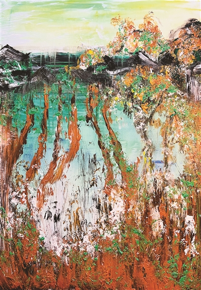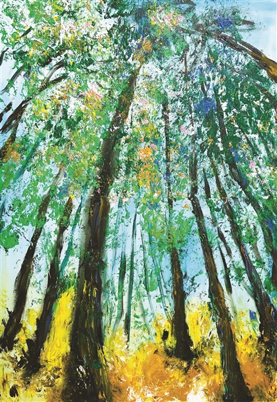 吳冠中老先生曾說,中國畫不能“近親結(jié)婚”。因?yàn)槲覀兊囊曇蔼M窄。藝術(shù)是相通的,不分東方和西方。因此,劉家男不斷吸收東西方精華,并運(yùn)用于作品之中。她的作品既能呈現(xiàn)出西方作品的色彩美感,同時(shí)又兼具中國潑墨的畫面呈現(xiàn)。無論是胡楊林系列,還是天端系列、鯨落系列以及自然系列,其作品的整體色彩都是非常大膽的,給人以強(qiáng)烈的視覺沖擊。劉家男認(rèn)為,這是一個(gè)藝術(shù)家應(yīng)有的標(biāo)志性符號(hào)。