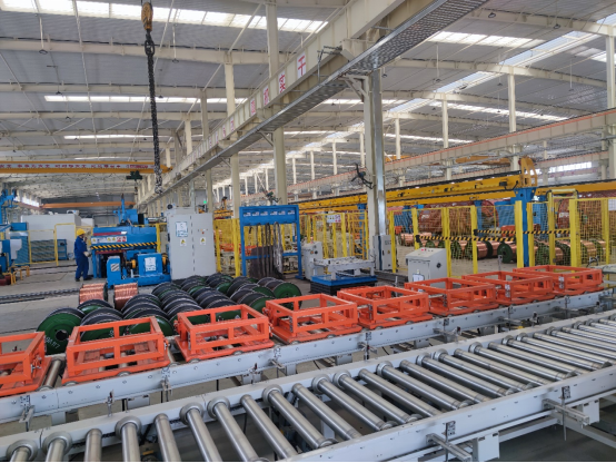 藍(lán)色自行小車把巨大的電纜軸送到既定位置,黃色的機(jī)械臂將線軸卡好,設(shè)備啟動(dòng)后線纜開始自動(dòng)纏繞,一盤整齊的電纜線慢慢成型。車間里,紅、黃、藍(lán)、白色的機(jī)械臂、自行小車等機(jī)械設(shè)備分工合作,有條不紊地生產(chǎn)。諾大的廠房中,零星行走著幾位身著藍(lán)色工裝、頭戴安全帽的工作人員。