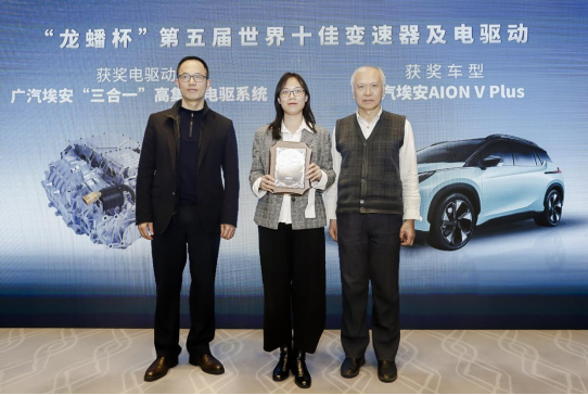 電動(dòng)汽車電驅(qū)動(dòng)系統(tǒng)全產(chǎn)業(yè)鏈技術(shù)創(chuàng)新戰(zhàn)略聯(lián)盟理事長貢俊(左1)與清華大學(xué)車輛與運(yùn)載學(xué)院教授宋健(右1)為廣汽埃安品牌傳播部公關(guān)經(jīng)理潘昱(中)頒獎(jiǎng)