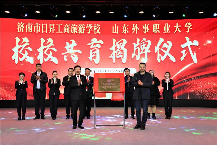 濟(jì)南市日昇工商旅游學(xué)校黨支部書(shū)記楊楠與山東外事職業(yè)大學(xué)副校長(zhǎng)孫彤宇共同為山東外事職業(yè)大學(xué)“合作共建單位”揭牌。