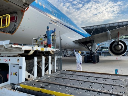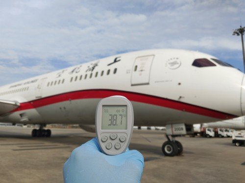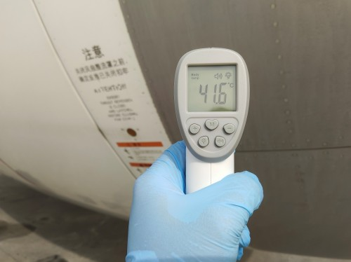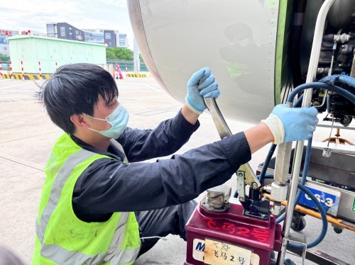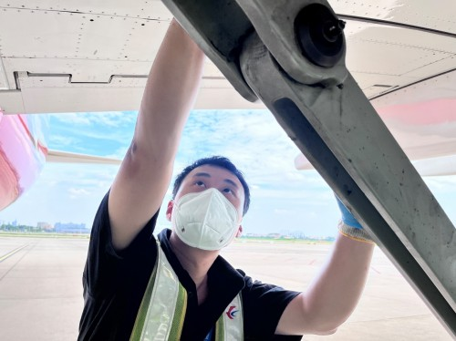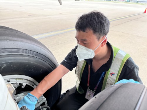 擦拭飛機起落架鏡面是航線保障中很尋常的一項工作,但由于今天外部氣溫較高,吸油棉接觸飛機鏡面后,東航機務員工的手心瞬間感覺炙熱