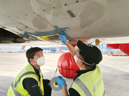 由于溫度較高,機務人員細心地檢查封存膠帶的粘性,避免由于高溫軟化或脫膠,以及對飛機表面產(chǎn)生腐蝕。雖然在機腹陰涼處,兩位機務小伙還是感覺層層熱浪