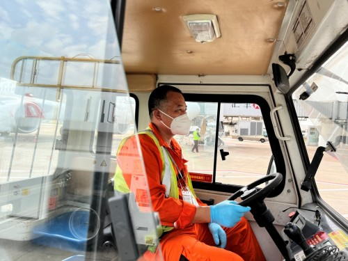 MU6328航班到達行李運送中,開窗通風才能讓小小的行李牽引車車內(nèi)溫度降低點。