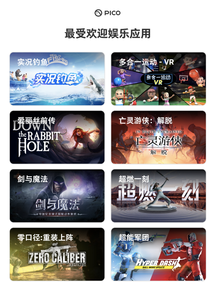 作為頭部XR品牌,PICO始終致力于幫助VR開啟大眾化之路,而豐富且優(yōu)質(zhì)的內(nèi)容和應(yīng)用生態(tài),是吸引大眾消費者購買VR、使用VR的關(guān)鍵。近兩年全球VR技術(shù)日漸成熟,產(chǎn)品快速迭代,PICO作為國內(nèi)最完善的VR內(nèi)容平臺,亦在持續(xù)完善內(nèi)容生態(tài),積極加速與第三方的合作腳步,并在自制內(nèi)容方面大力投入,致力打造國內(nèi)應(yīng)用最豐富、最優(yōu)質(zhì)的VR內(nèi)容平臺。迄今為止PICO應(yīng)用商店已擁有超過200款國內(nèi)外優(yōu)質(zhì)的VR應(yīng)用。