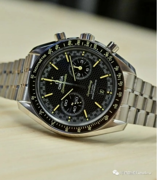 超霸Super Racing的盤(pán)面布局,是雙眼計(jì)時(shí)盤(pán),3點(diǎn)位是60分鐘和12小時(shí)計(jì)時(shí)盤(pán) (兩根計(jì)時(shí)指針是同軸的),9點(diǎn)位是小秒針。但凡是歐米茄9系計(jì)時(shí)機(jī)芯,都是這種布局。手表盤(pán)面上呈現(xiàn)“蜂巢”結(jié)構(gòu)。