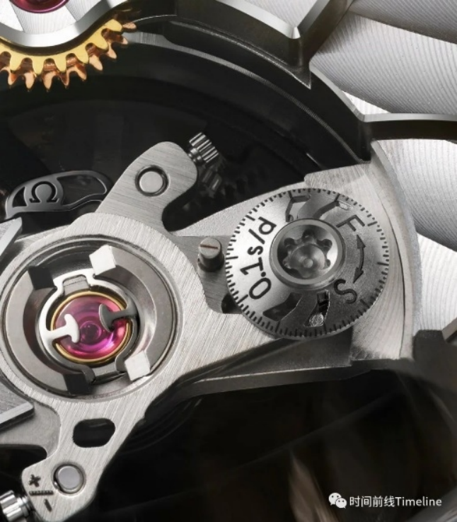 擺輪夾板上的小圓片,下面有一個(gè)凸輪。凸輪可以帶動(dòng)硅游絲“刀片”造型的末端,從而壓縮或放松硅游絲,以此改變硅游絲的“彈跳能力”、“彈跳半徑”(即,剛性),實(shí)現(xiàn)對(duì)手表走時(shí)的高精度調(diào)節(jié)。