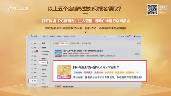 對(duì)于已入駐抖音電商且體驗(yàn)分>4.5的商家,平臺(tái)帶來(lái)了五大店鋪權(quán)益。商家打開(kāi)抖店-PC版后臺(tái),進(jìn)入營(yíng)銷(xiāo)-活動(dòng)廣場(chǎng),即可報(bào)名領(lǐng)取相關(guān)權(quán)益。
