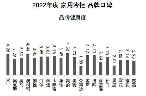 品牌健康度方面,美的、澳柯瑪、TCL位居前三。美的、澳柯瑪、統(tǒng)帥、容聲、卡薩帝、海爾、海信、新飛、美菱在近兩期中均位居前十。TCL在本期晉升至前十,奧馬則掉出前十。
