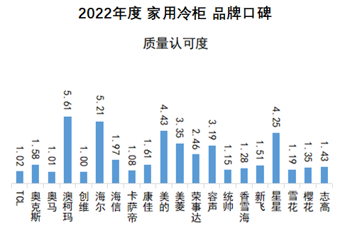 質(zhì)量認可度方面,澳柯瑪、海爾、美的位居前三。澳柯瑪、海爾、美的、星星、美菱、容聲、榮事達、海信、康佳、奧克斯在近兩期中均位居前十。