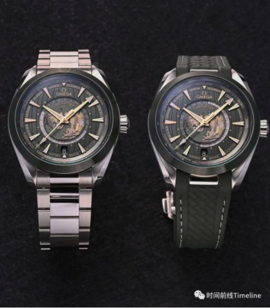這款世界時的細(xì)節(jié)在于,內(nèi)表盤的海洋顏色與手表配色一致,鈦殼是灰色、鋼殼是綠色;陸地則采用激光技術(shù)進(jìn)行著色,金色是高海拔地區(qū)。其中鈦金屬表盤的黑灰色都是由激光歐米茄的地圖是以北極為中心的北半球,我們可以注意到,地圖帶有微微的弧形效果,模仿了真實的地球曲率。盤面上帶地圖的表不少,但像歐米茄做的這么細(xì)致真實的,極少。